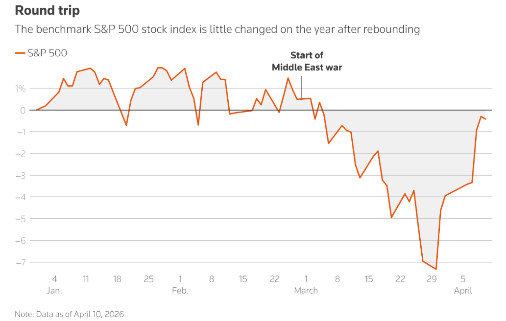 上图为标普500指数的年初至今表现。截至上周五美股收盘,标普500指数几乎收复了自美国与以色列在2月下旬开始向伊朗发动军事打击以来的全部跌幅,在此期间该基准指数跌幅已不到1%。