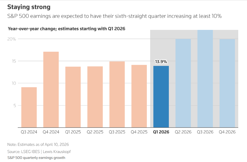 第一季度美股财报季将随着高盛、摩根大通以及美国银行等华尔街系统重要性的这些大型商业银行发布业绩报告而拉开帷幕。市场对利润增长将迎来强劲季度和强劲全年表现的强劲乐观预期,一直支撑着美国乃至全球股市的看涨前景。在过去一个月中东地缘政治冲突持续发酵以及两周停火协议令市场狂欢之际,这些预期依然完好无损。