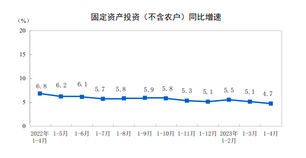1-4月份,全国固定资产投资(不含农户)147482亿元,同比增长4.7%,比1-3月份回落0.4个百分点。分领域看,基础设施投资同比增长8.5%,制造业投资增长6.4%,房地产开发投资下降6.2%。从环比看,4月份固定资产投资(不含农户)下降0.64%。