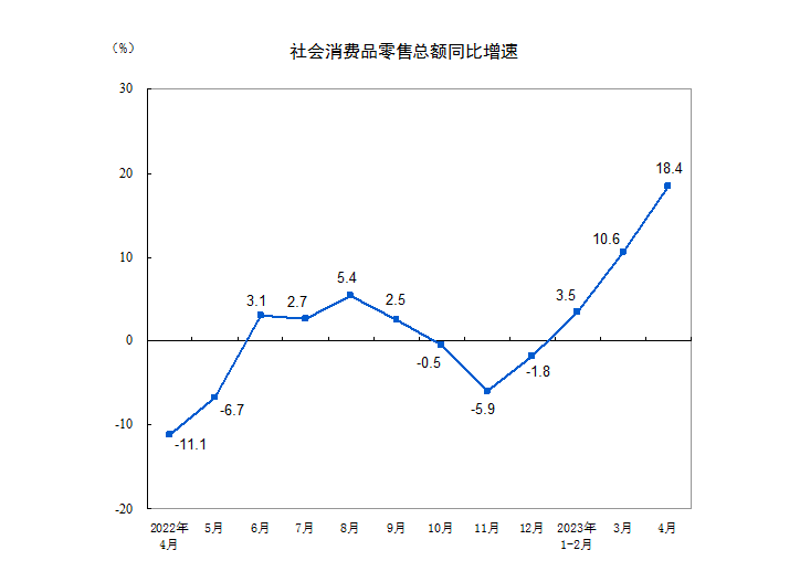 国家统计局5月16日发布4月份经济数据,社会消费品零售总额同比增长18.4%,增速比3月加快7.8百分点,规模以上工业增加值同比增加5.6%,比3月加快1.7个百分点。1-4月,全国固定资产投资同比增长4.7%,增速较前3个月降低0.4个百分点,其中,基建投资、制造业投资增速回落,房地产投资增速降幅扩大。