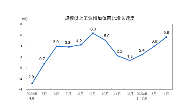 工业方面,4月份,全国规模以上工业增加值同比增长5.6%,比上月加快1.7个百分点;环比下降0.47%。