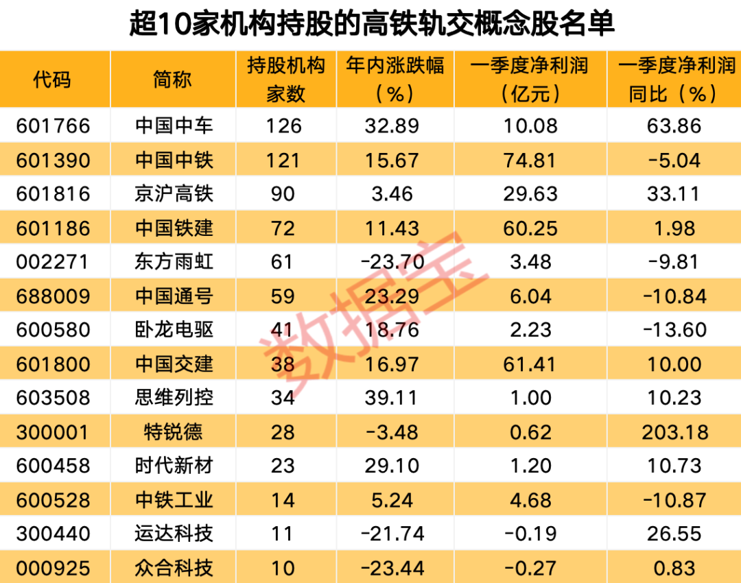 一季报数据显示,14只高铁轨交概念股获得超10家机构扎堆持仓,中国中车、中国中铁、京沪高铁、中国铁建的持股机构数分别达126家、121家、90家和72家。