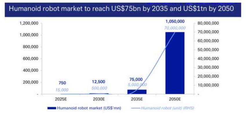 国际大行德意志银行(Deutsche Bank)近日在一份研报中表示,人形机器人将在未来十年内迎来大规模机器人生产和广泛应用;德银分析团队预计到2035年,人形机器人市场规模预计将达到750亿美元,以及到2050年,市场规模有望达到1万亿美元,全球销量可能突破7000万台。