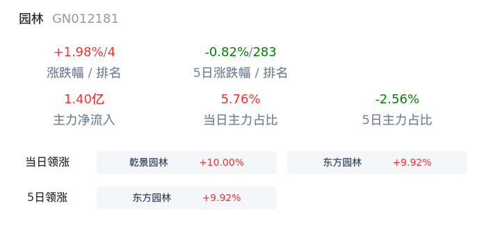 园林在所有概念板块中名列前茅,位居第4,被市场高度关注,值得跟踪。板块中共计2只股票涨停。资金方面,主力呈现一定程度买入力度,继续观察持续性。板块龙头股方面,东方园林最近处于领涨位置,近5日累计涨幅12.71%,累计成交24.55亿元。资金持续推动股价走高,只要资金态度不改,未来走势乐观。乾景园林当日强势涨停,成交2.76亿元。资金呈现流入状态,如果主力态度延续,则空间被进一步打开。从牛熊点角度看,园林板块近期出现日线级别熊点,且60分钟级别也处于熊点区间,指数处于偏弱行情,建议谨慎观望。