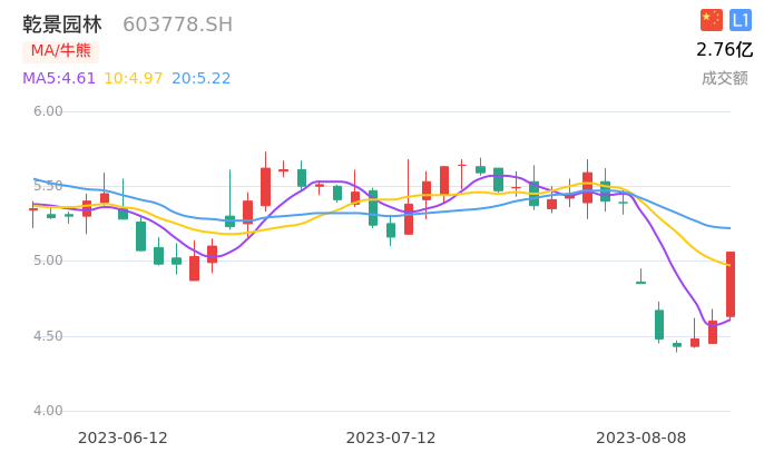 乾景园林在8月1日出现熊点,在7月28日出现MACD0轴以上的死叉,且在8月2日出现了双线下穿0轴,目前处于弱势调整阶段,后续关注MACD能否重新金叉。 5日累计DDX为-0.646,呈现一定程度的大单流出。近5日累计上涨4.33%,股价涨、资金出往往预示着行情空间不大,可结合其他分析及时落袋为安。 乾景园林所属基础建设行业,行业当前的PE(TTM)平均值为38.25,属于近3年的较低水平。但是,公司最近四个季度净利润合计为亏损,建议警惕风险。 乾景园林在行业内比较基本面数据较差。而且技术面无法支撑,资金面尚未获得市场认可,短期存在一定风险,建议控制仓位,谨慎对待。
