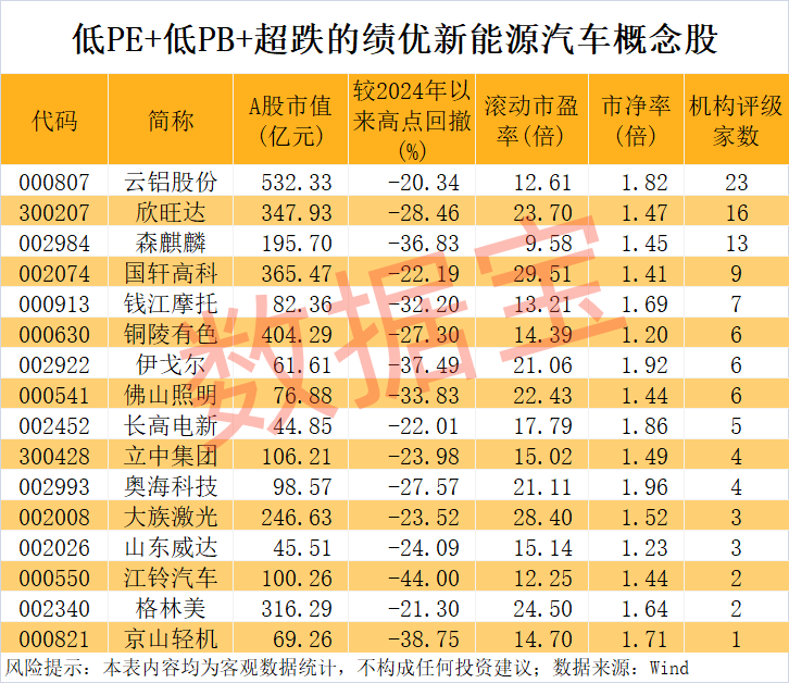 从估值水平来看,截至4月25日收盘,上述业绩增长的新能源汽车概念股中,最新收盘价较2024年以来高点回撤20%以上,同时滚动市盈率(PE)低于30倍,且市净率(PB)低于2倍的有16股。