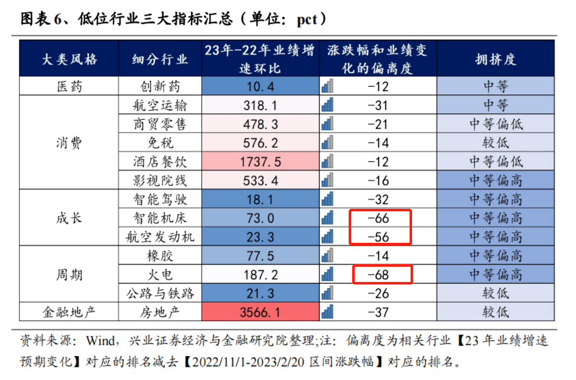 从区间涨跌幅排名小于业绩预期改善排名来看,张启尧指出,火电(周期)涨跌幅和业绩变化的偏离度最大,智能机床(成长)偏离度次之,航空发动机(成长)排名第三。这三大细分行业业绩改善空间大、股价尚未充分price in业绩预期、且拥挤度相对较低,有望实现低位补涨。