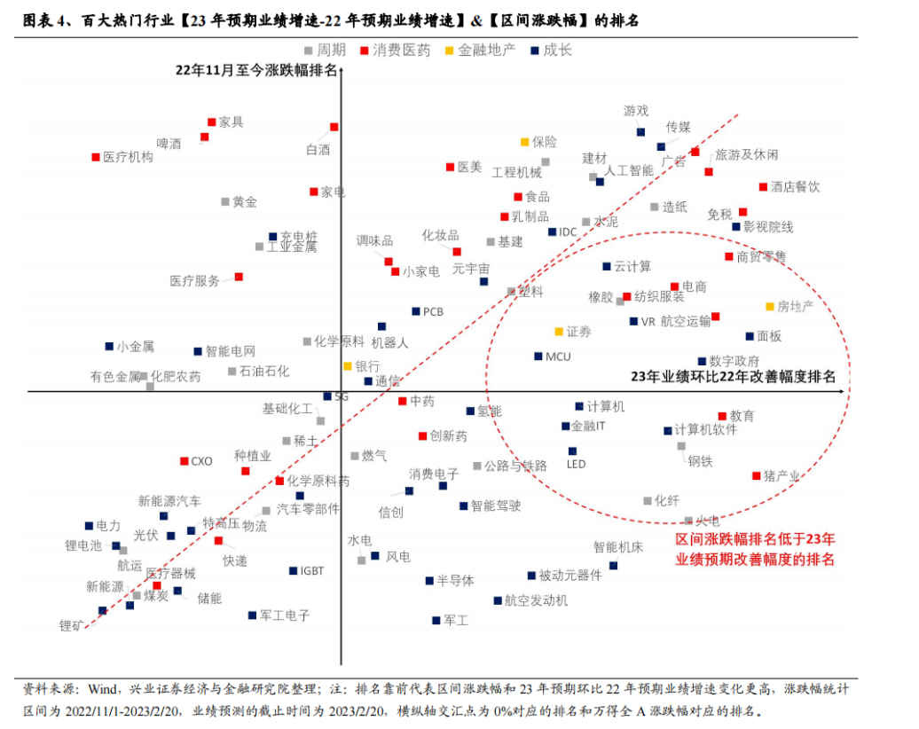兴业证券策略团队张启尧2月22日发布的研报指出,截至2月20日,百大热门行业自去年11月初以来的市场表现和其23年景气度的预期变化具有较为明显的正相关性(二者之间的相关系数为0.4)。因此,【23年预期业绩增速-22年预期业绩增速】&【2022/11/1-2023/2/20区间涨跌幅】排名的匹配程度在一定程度上可以体现市场是否充分反映板块23年业绩增速的改善预期。区间涨跌幅排名低于其2023年预期景气度变化的排名,或指向相关行业的基本面改善预期尚未被市场充分兑现。