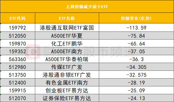 在上周份额减少前十的ETF中,港股通互联网ETF富国(159792)上周份额减少113.59亿份位居首位。