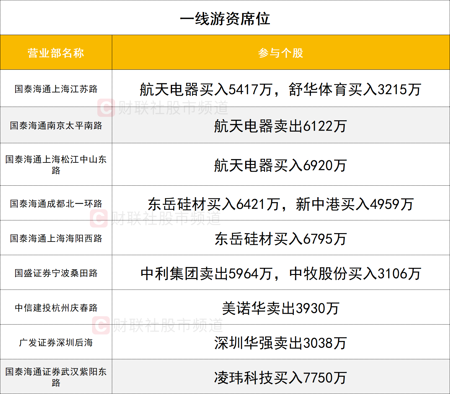 一线游资活跃度有所降低,航天电器获两家游资(国泰海通证券上海中山东路、国泰海通证券上海江苏路)合计买入1.23亿。