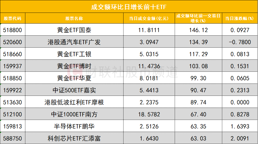 从成交额环比增长前十的ETF来看,黄金ETF国泰(518800)成交额环比增长146%位居首位;港股通汽车ETF广发(520600)成交额环比增长134%位居次席。