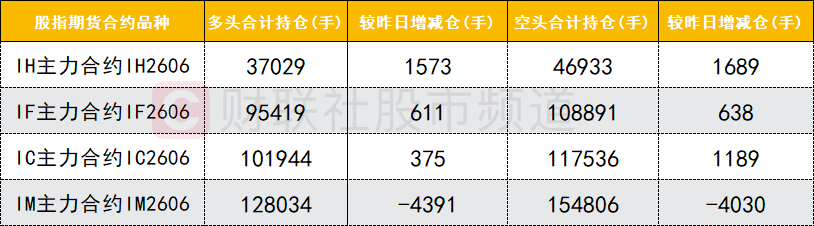 四大期指主力合约中,IH、IF、IC合约多空双方均加仓,IC合约空头加仓数量较多,IM合约多空双方均减仓。