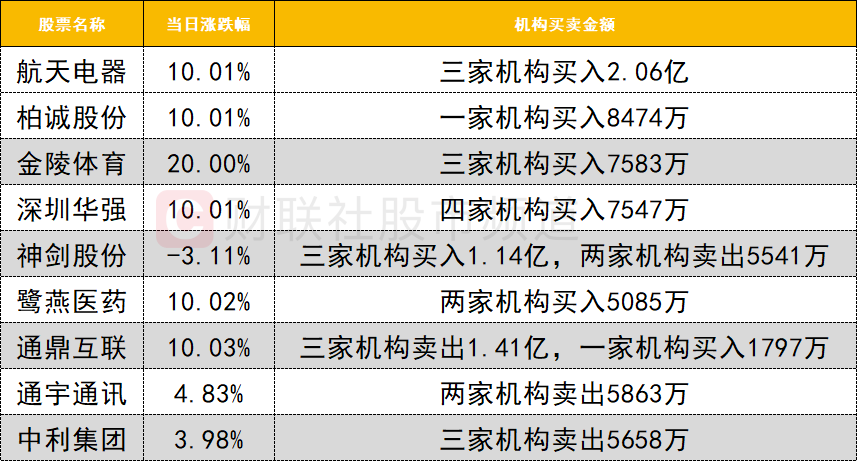 今日龙虎榜机构活跃度较高,航天电器强势涨停,获三家机构买入2.06亿。体育概念反复活跃,金陵体育20CM涨停,获三家机构买入7583万。光纤概念股通鼎互联遭三家机构卖出1.41亿,同时获一家机构买入1797万。