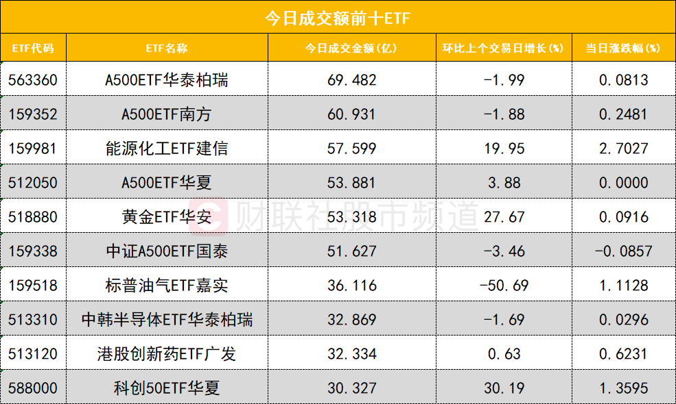 从成交额前十的ETF来看,A500ETF华泰柏瑞(563360)成交额位居首位,A500ETF南方(159352)成交额位居次席。