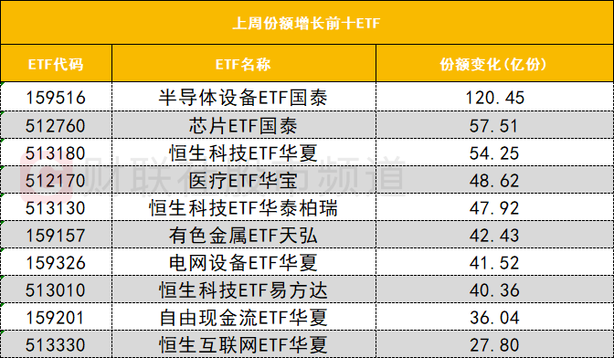 在上周份额增长前十ETF中,半导体设备ETF国泰(159516)上周份额增长120.45亿份位居首位;芯片ETF国泰(512760)上周份额增长57.51亿份位居次席。