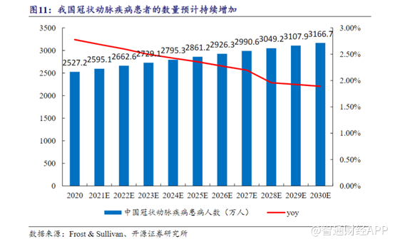 据Frost & Sullivan的预测,中国冠状动脉疾病患者的数量将从2020年2527.2 万人增长到2030年的3166.7万人,2020-2030年CAGR约为2.28%。