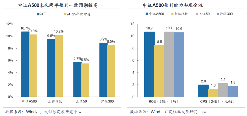 成分股一致预期净利润增速好于其他指数。成长能力方面,中证A500指数在24年、25年一致预期净利润增速要好于其他指数。中证A500指数归母净利润增速(24E)为10.7%,高于上证指数、上证50、沪深300指数的9.4%、5.7%和8.9%。股息率方面,指数当前股息率TTM3.2%、也高于全部A股的股息率TTM的中位数1.6%水平。盈利能力和现金流方面,中证A500指数24年一致预期的ROE与每股现金流分别为10.7%与2.0元/股,与沪深300与上证50相近,高于上证指数。