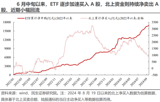 6月中旬以来,ETF逐步加速买入A股,主要围绕沪深300、中证1000、创业板指等领域北上资金则持续净卖出A股、近期小幅回流。公募基金2024年中期报告显示,二季度,中央汇金继续买入宽基ETF。