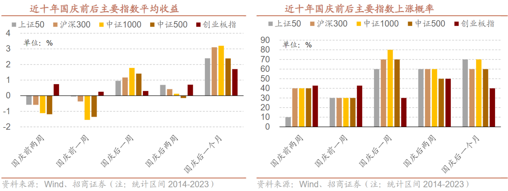 从近十年国庆节后行业表现来看,国庆后五个交易日上证指数、沪深300、中证1000指数或一级行业上涨概率普遍在50%以上。