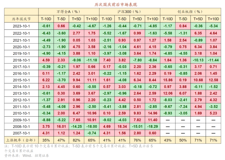 A股国庆节前后市场表现通常呈现出一定的日历效应。国庆节后市场风险偏好改善,主要指数往往迎来反弹。当前A股估值处于上市以来较低分位,大类行业中除金融、周期外其他行业估值大都处在历史底部,细分行业中多数处于2010年以来的40%以下分位数。