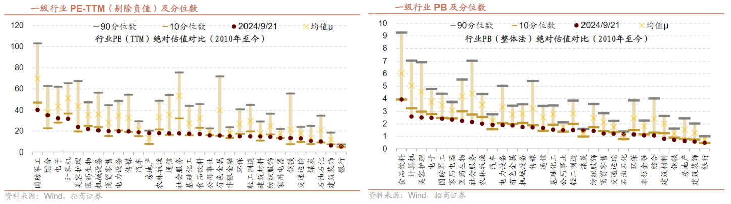 细分行业:多数处于历史底部,仅地产和煤炭高于历史中枢绝对估值方面。当前成长、医药和部分消费板块估值相对较高,地产产业链估值相对较低,其中国防军工、电子、计算机板块市盈率(剔除负值)分别为40.3倍、32.3倍、31.8倍,领先申万一级行业,其次美容护理、医药生物、机械设备板块估值也居于前列。地产产业链相关的建筑装饰、煤炭、石油石化、钢铁、家用电器、建筑材料等估值相对较低,均低于15倍。分位数看,当前大多数行业处于2010年以来的40%以下分位数,仅钢铁、汽车、房地产、煤炭、建筑材料处于2010年以来40%以上分位,其中房地产、煤炭分别处于77.2%和57.7%的较高分位。消费医药板块如农林牧渔、食品饮料、纺织服饰、轻工制造、社会服务、医药生物以及机械设备、电力设备、建筑装饰等均处于2010年以来10%以下分位。