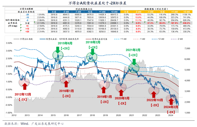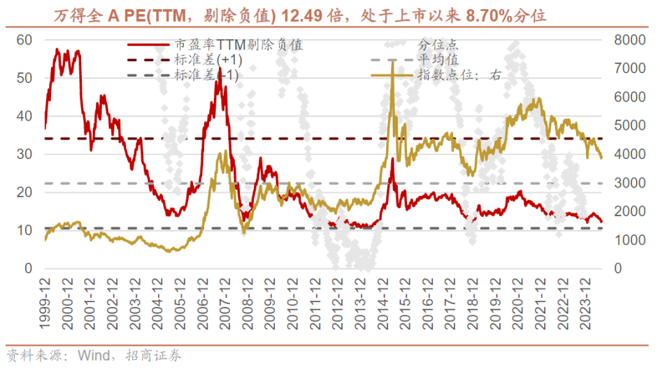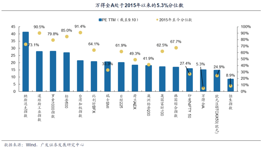 从投资角度来看,A股当前估值处于历史底部区域。截至9月10日,万得全A的市盈率位于2015年以来(过去十年)5.3%分位数,而股债收益差已经低于历史中枢-2倍标准差。