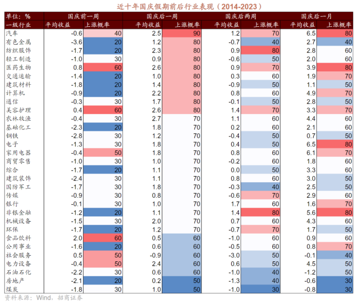 从行业表现来看,国庆后五个交易日一级行业上涨概率普遍在50%以上,其中上涨概率靠前的行业集中在汽车、有色、纺织服饰、轻工制造、医药生物等行业,其中汽车和医药生物在国庆后两周和国庆后一个月上涨概率仍然较高。