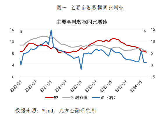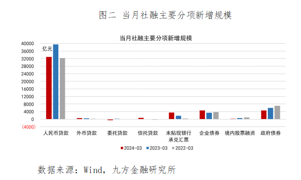 根据人民银行发布的数据,2024年2024年一季度人民币贷款增加9.46万亿元,其中3月人民币贷款增加3.09万亿元;一季度社会融资规模增量累计为12.93万亿元,比上年同期少1.61万亿元,其中3月社会融资规模增量为4.87万亿元。社融、M1、M2同比分别增长8.7%、1.1%、8.3%,较上月分别下降0.3、0.1、0.4个百分点。从几项主要指标的表现来看,3月金融数据的表现偏弱。从分项数据来看,九方金融研究所宏观团队认为3月的金融数据中有以下几点值得关注: