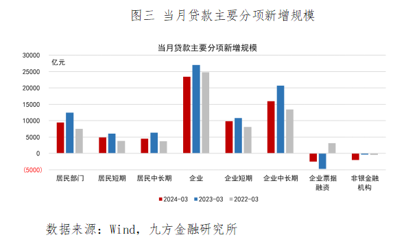 再次,主要贷款分项均较去年同期少增,仅企业票据融资同比多增。3月新增贷款规模为3.09万亿,同比少增8000亿,无论是居民短期、中长期贷款还是企业短期、中长期贷款同比少增均超1000亿,仅企业票据融资同比好转,但这也并不是一个较好的信号。其中,企业中长期贷款同比少增4700亿,或表明当前企业融资扩产意愿偏低。而居民中长期贷款同比同样少增超1800亿,或说明今年地产“小阳春”表现并不理想。