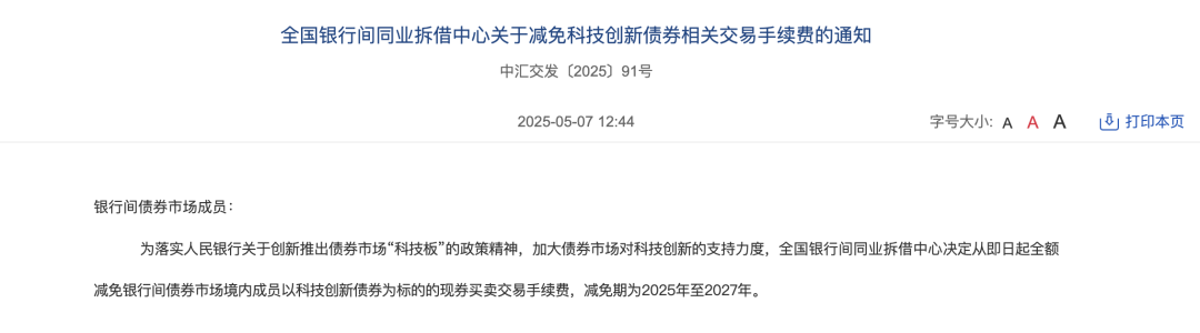 5月7日,全国银行间同业拆借中心发布通知,为落实人民银行关于创新推出债券市场“科技板”的政策精神,加大债券市场对科技创新的支持力度,全国银行间同业拆借中心决定从即日起全额减免银行间债券市场境内成员以科技创新债券为标的的现券买卖交易手续费,减免期为2025年至2027年。