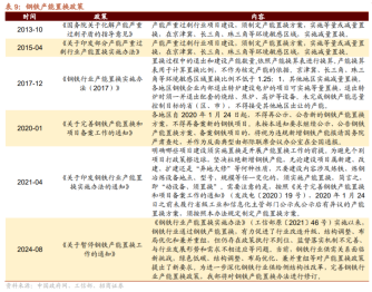 产能置换要求行业在新建或改造产能时,必须通过等量置换或减量置换的方式,淘汰一部分的落后或过剩产能。等量置换是指建设项目应淘汰与该项目产能数量相等的落后或过剩产能;减量置换是指建设项目应淘汰大于该项目产能数量的落后或过剩产能。自2013年以来,钢铁产能置换政策不断优化,目前正在进行新一轮的修订。2024年8月工信部发布《关于暂停钢铁产能置换工作的通知》,要求各地区自2024年8月23日起,暂停公示、公告新的钢铁产能置换方案。在此之前的2020年也曾出现过暂停公示和公告新的钢铁产能置换方案,不再备案新的钢铁项目,并同步修订产能置换办法,在暂停15个月后发布了新版本的产能置换办法。