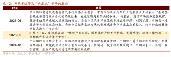 推动并购重组也是化解产能结构性问题的一大重要手段:从2010年首个高级别支持并购重组的意见出台开始,支持化解过剩产能就已成为并购重组的一大主要目的。本轮整治“内卷式”竞争再提并购重组,从具体行业表态来看,钢铁、新能源汽车有相关表态。