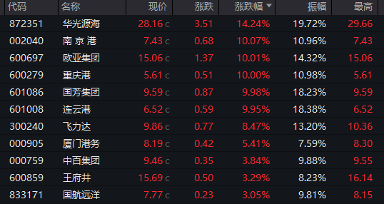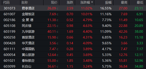旅游出行板块大幅走高,截至收盘,君亭酒店涨约11%,金陵饭店涨停,天府文旅涨近7%,全聚德、同庆楼涨近5%。