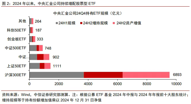 2024年2月中央汇金公司公告扩大交易型开放式指数基金(ETF)增持范围以来,汇金增持方向逐渐多元化,均衡成长/价值、大盘/小盘风格。根据公募ETF基金2024年中报与2024年年报前十大股东统计,汇金公司在2024年末合计持有股票型ETF的规模为10439亿元,较2024年中的5839亿元提升4600亿元;结构上看,汇金公司主要持有沪深300、上证50、中证1000、中证500等宽基ETF,2024年末300ETF、上证50ETF、中证1000ETF、中证500ETF分别合计持有6893亿元、1111亿元、902亿元、748亿元,较年中分别增加3191亿元、408亿元、258亿元、381亿元,此外,科创50ETF获得明显增配,2024年末持有规模为187亿元,较2024年中提升104亿元,其中57亿元来自于增持。