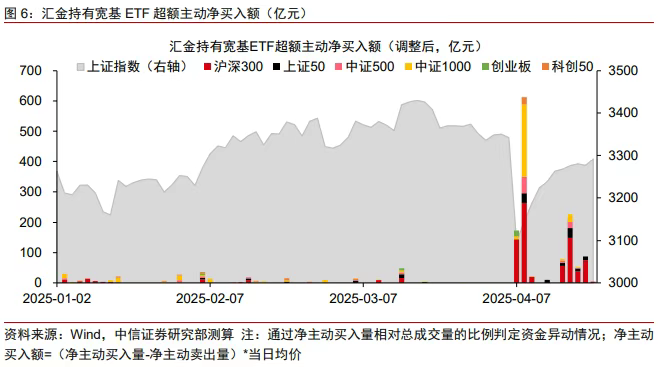 ▍通过份额申赎、成交量、净主动买入水平等方式跟踪测算,2025年4月以来,汇金持有的ETF获明显的资金净流入,且结构上更加均衡。