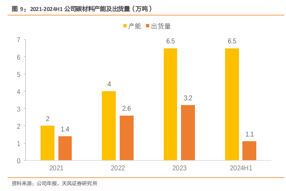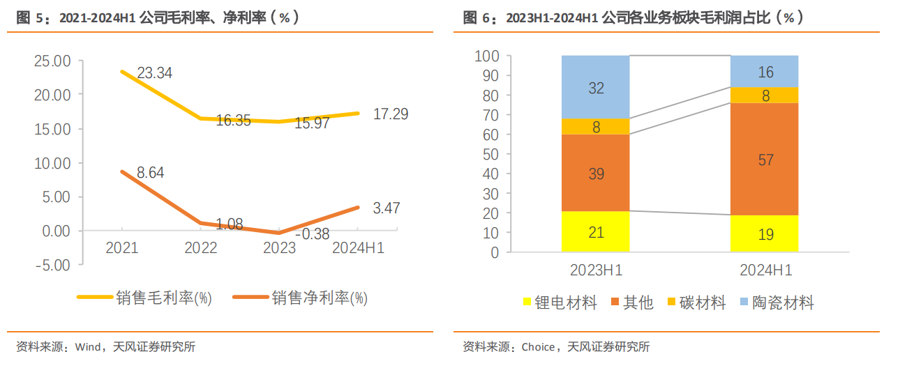 碳材料进入利润率回升周期,后续看新客户/新产品放量。24H1公司碳材料营收为3.3亿元,同增12%;毛利率为16.86%,同增5.5pct,将通过精细化经营和持续产品迭代继续推动利润率回升。