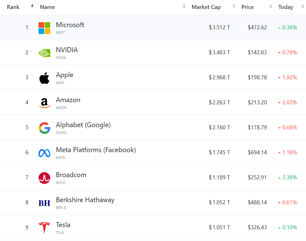 大型科技股多数走低,(按市值排列)微软涨0.36%,重回全球股王,英伟达跌0.78%;苹果跌1.92%,总市值跌破3万亿美元;亚马逊跌2.03%,谷歌C跌0.68%,Meta跌1.18%,特斯拉涨0.1%。