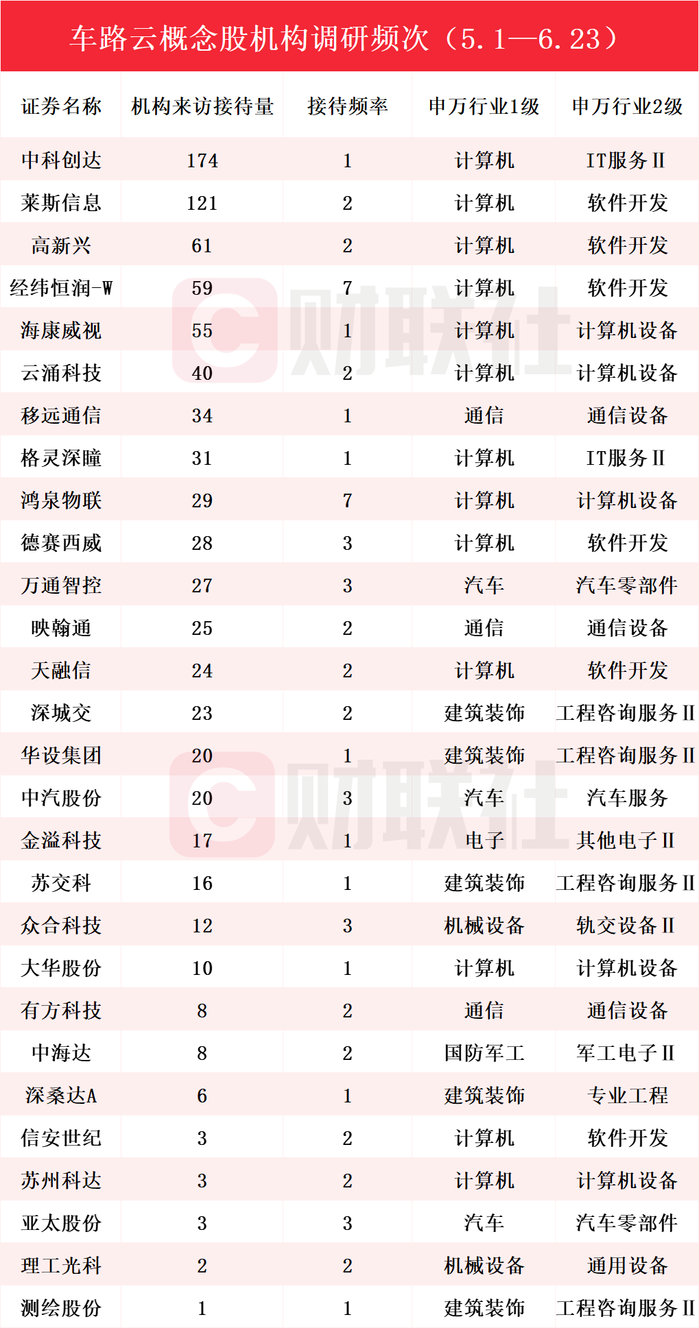 值得注意的是,据不完全统计,中科创达、莱斯信息、海康威视、云涌科技、格灵深瞳、德赛西威、万通智控、映翰通、华设集团、苏交科、大华股份、有方科技、深桑达A、信安世纪、亚太股份、理工光科均涉及车路云相关业务,机构来访接待量分别为174、121、55、40、31、28、27、25、20、16、10、8、6、3、3、2。但上述16家上市公司均未在同期机构调研中明确回复车路云相关布局。