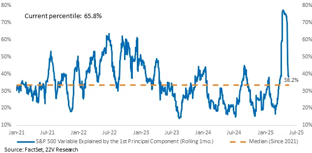 数据显示,当前标普500指数略超三分之一的每日波动可以用关税相关的新闻来解释,这与任何可能影响市场的长期因素中值一致。与此相比,这一比例在4月初一度飙升至80%。