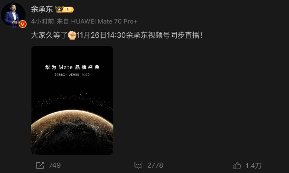 据了解,华为Mate 70将搭载新麒麟芯片,且首发搭载华为纯血鸿蒙操作系统。此前,华为常务董事、终端BG董事长余承东曾在个人微博上表示,史上最强大的Mate,11月见。之后,上周,余承东又在一次对外活动中透露了有关Mate的数字“26”,因此外界猜测华为Mate 70将于11月26日发布。11月18日早间,余承东发文官宣华为Mate 70系列11月26日发布:“大家久等了,11月26日14:30余承东视频号同步直播!”