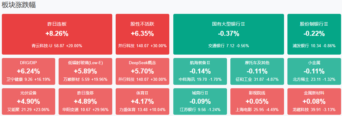 板块方面,DeepSeek、光伏、DRG/DIP、算力、海南自贸区板块涨幅居前;银行等少数板块下跌。