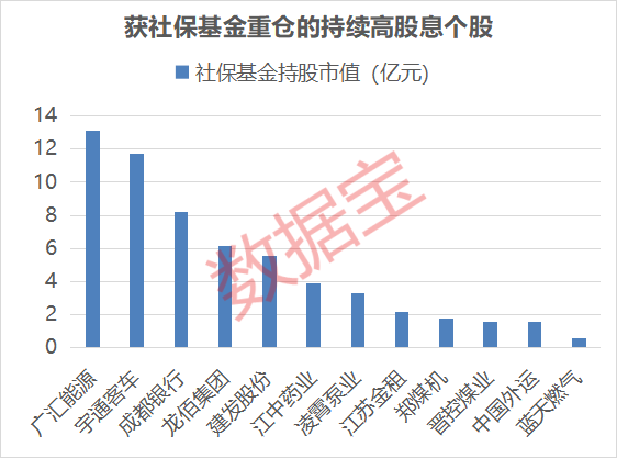 高股息资产历来是社保基金重点投资的板块,数据显示,上榜个股中12股今年一季报前十大流通股东名单中出现社保基金的身影,从持股市值上来看,广汇能源社保基金持股市值最高,达到13.1亿元,宇通客车、成都银行、龙佰集团紧随其后,分别达到11.73亿元、8.19亿元、6.18亿元。