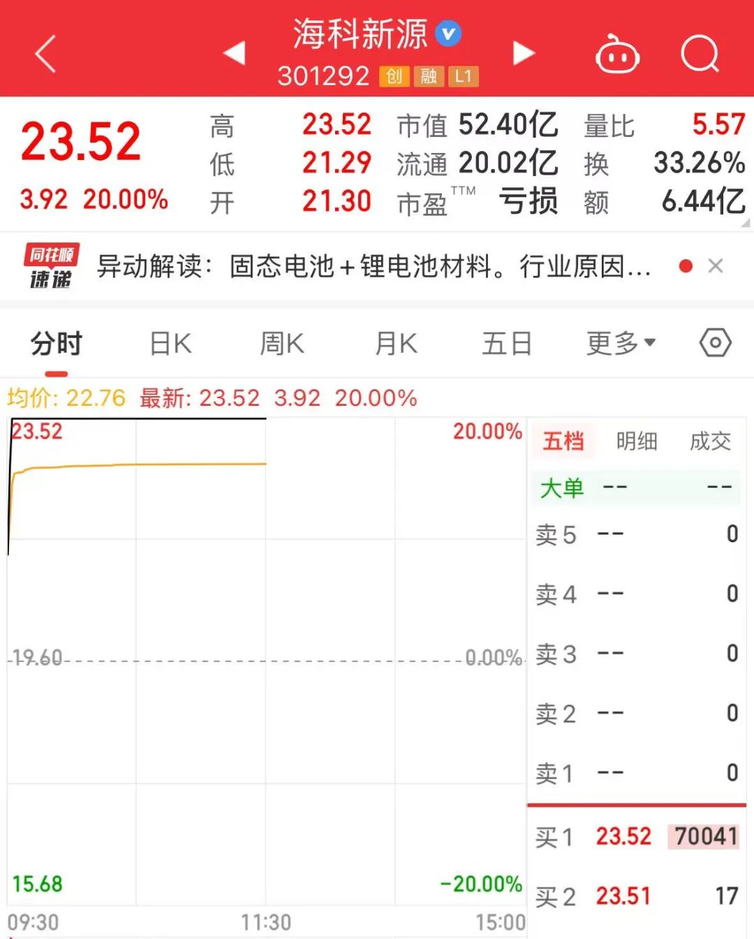 固态电池板块延续近期活跃态势,龙头股海科新源(301292)开盘仅仅1分钟,就拉升至“20CM”涨停,迎来“两连板”。
