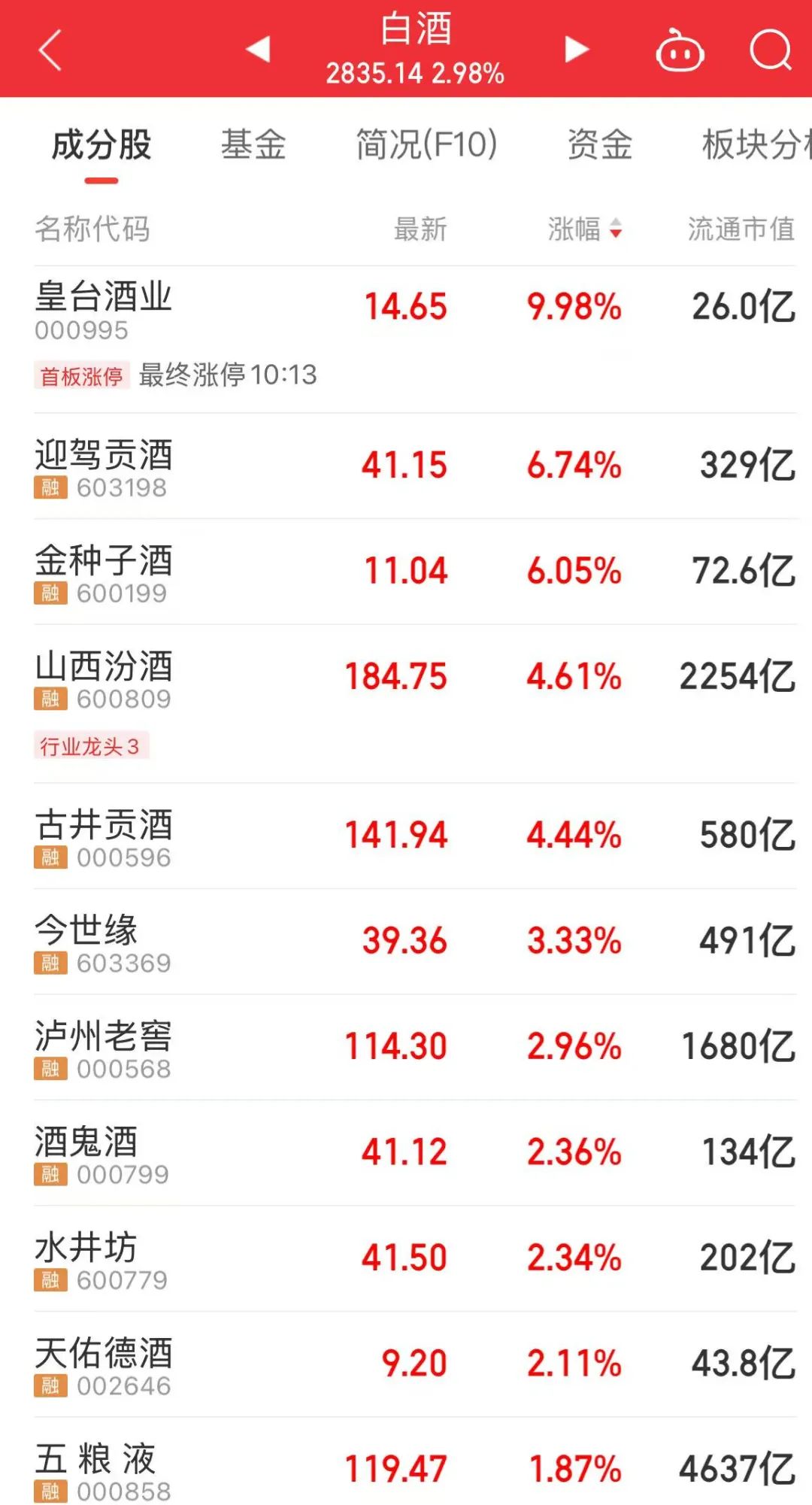 今天上午,白酒板块上涨,皇台酒业、金种子酒等个股大涨,“茅五泸”齐涨。