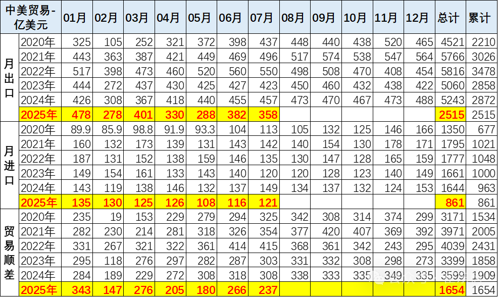 其中2025年中国对欧美国家的顺差巨大,对美国1-7月份顺差1655亿美元,对中国香港顺差1628亿美元,对印度和越南的顺差在600亿美元的好水平。2025年虽然在美国干扰等各种因素影响下,世界各地需求不足,中国出口总体表现依旧是极其优秀的。