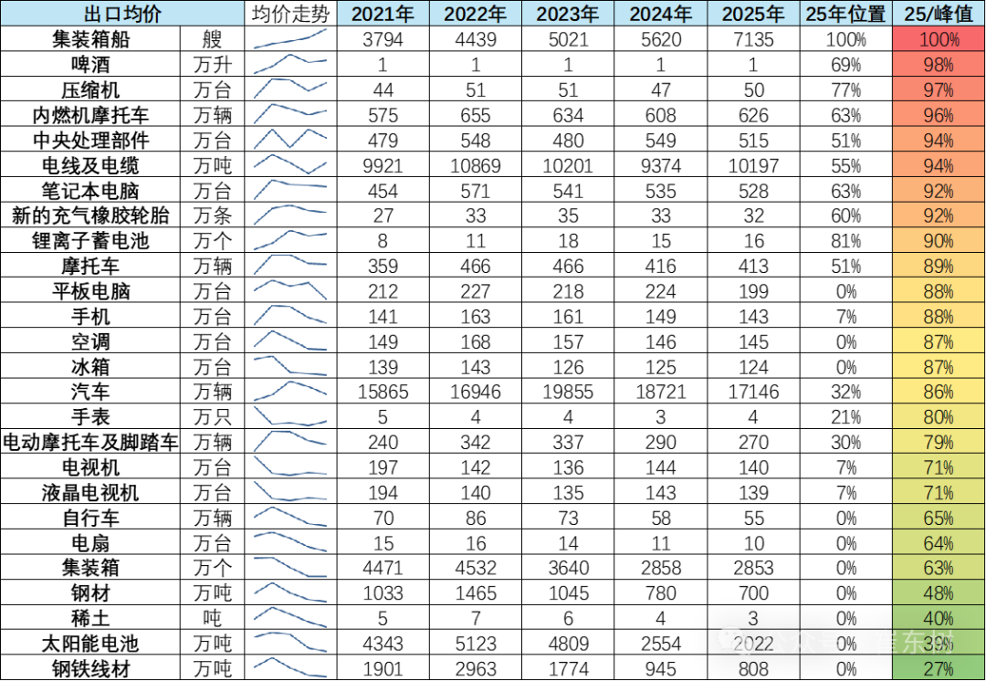 中国商品出口的总量与总额走势差异较大,部分商品近几年的价格相对坚挺,尤其是集装箱船、啤酒、摩托车表现较好。而光伏太阳能、钢材等均价下降较大。内卷主要是这些均价下降较大的。
