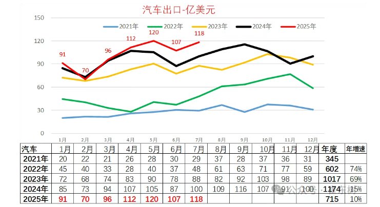 乘联分会秘书长崔东树发文称,中国汽车出口近几年从出口方面表现极其优秀,从2021年的345亿美元上升到2024年的1174亿美元,形成了爆发增长态势,而且在2025年依旧保持月度小幅的增长特征。在新三样中只有锂电池高增长,而汽车4-7月份也创历史新高的现象,中国汽车活力很强。