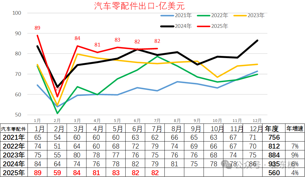 而在单品表现中可以看到,手机的单品表现在2022年1-7月份达到高位情况下稍有回落的现象,但是2025年仍然处于较好的高位,而乘用车出口在2025年达到了最高水平,而且汽车零部件也创历史新高的水平,都实现了超强的暴增的情况。