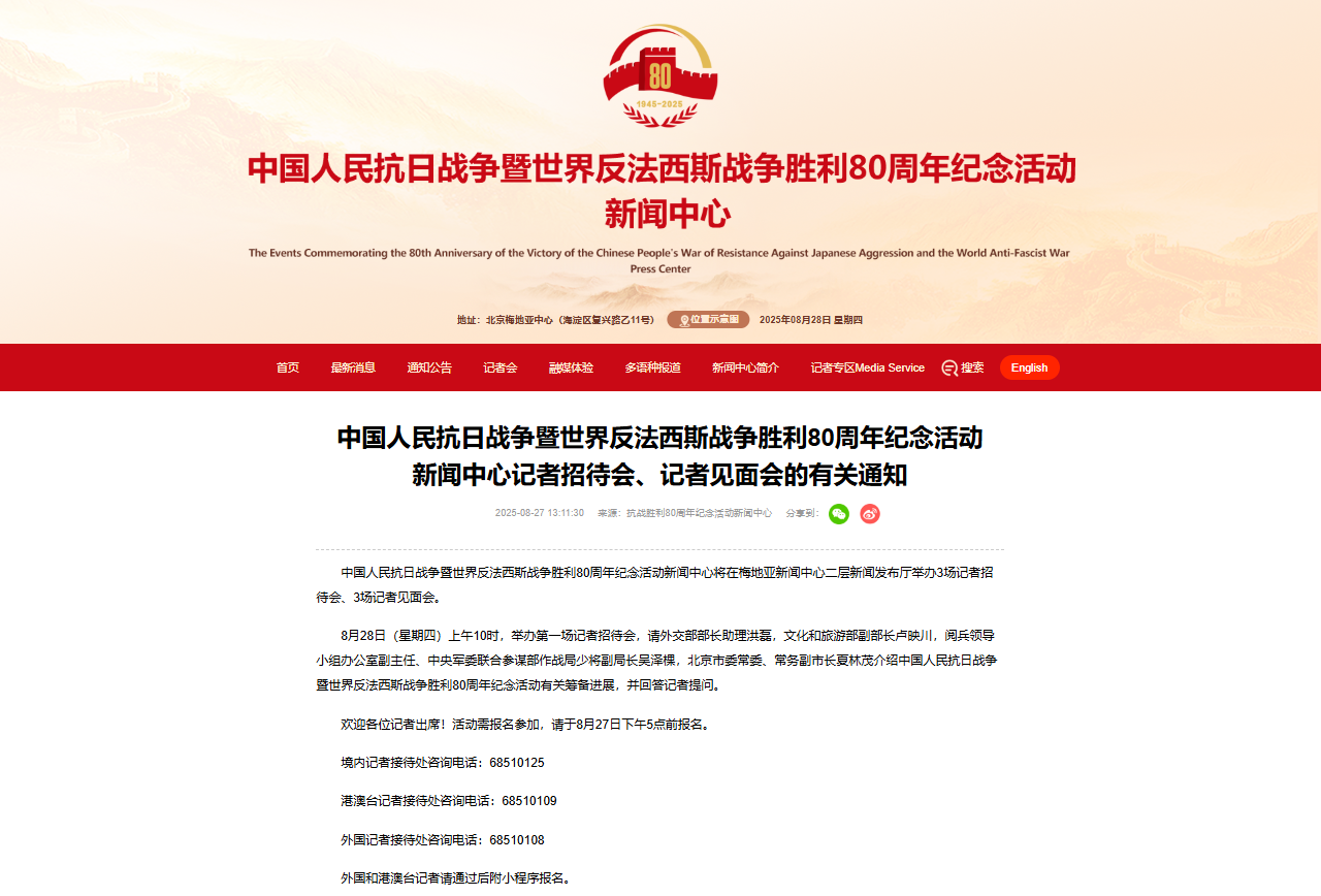 中国人民抗日战争暨世界反法西斯战争胜利80周年纪念活动新闻中心将在梅地亚新闻中心二层新闻发布厅举办3场记者招待会、3场记者见面会。