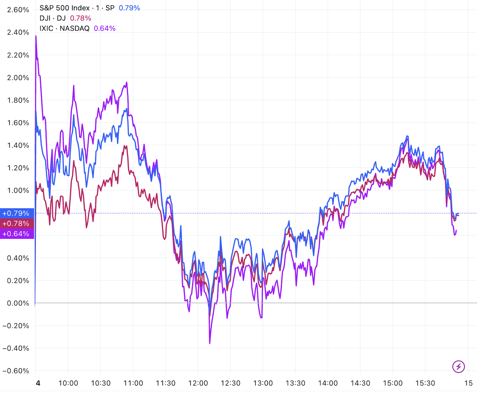 截至收盘,道琼斯指数涨0.78%,报40,524.79点;标普500指数涨0.79%,报5,405.97点;纳斯达克指数涨0.64%,报16,831.48点。